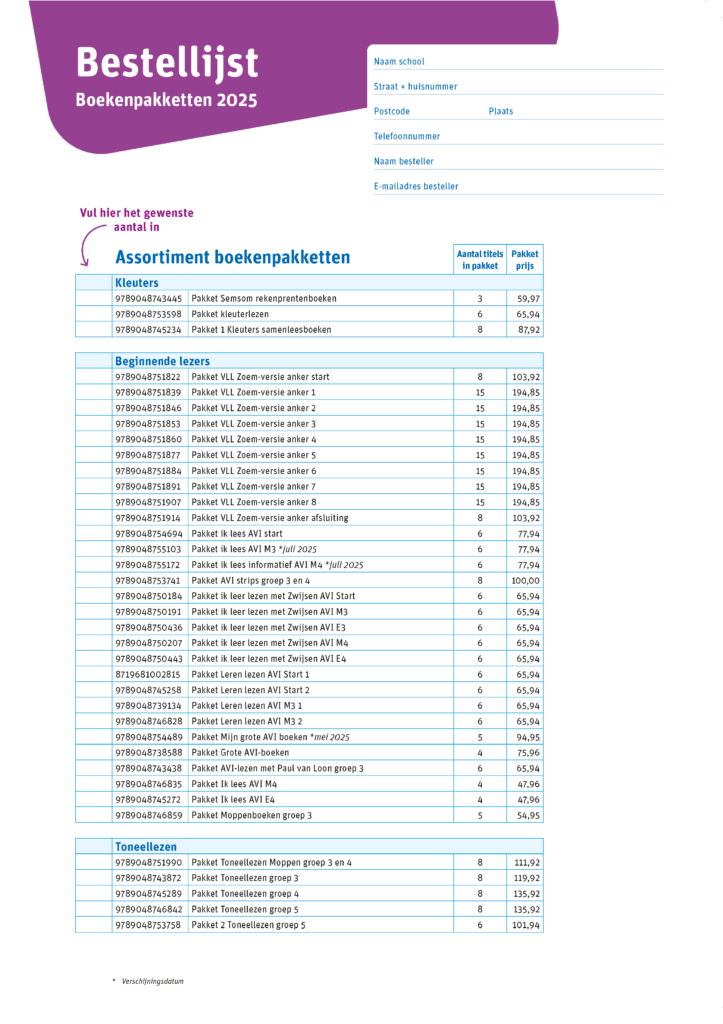Heb je boeken en spellen gevonden die je graag in jouw schoolbibliotheek wilt hebben? Download dan de bijgevoegde bestellijst. De digitale PDF is in te vullen, zodat je makkelijk al jouw gewenste boekenpakketten en spellen kunt aanvinken. Vul je contactgegevens in en geef vervolgens aan welke producten jij wilt bestellen. Stuur het ingevulde formulier naar onze Schoolbiebexpert Rebekka van Schelven (r.vanschelven@zwijsen.nl) en voila! Wij verzorgen jouw bestelling.