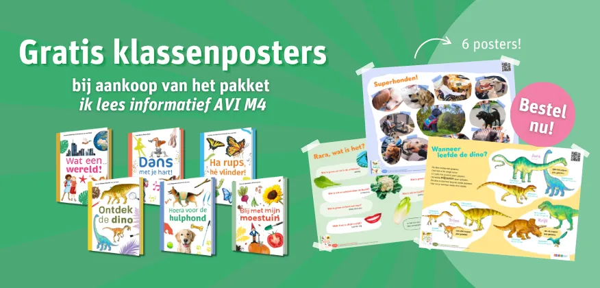 Bestel vóór 28 november het boekenpakket ik lees informatief AVI M4 (6 boeken) in de Zwijsen-webshop en ontvang 6 mooie posters voor in je klas!* Elke poster hoort bij een boek en bevat kleurrijke beelden of illustraties uit het verhaal. Leuk om het thema van het boek in de klas te bespreken en samen verder te ontdekken. Tip: de boeken passen ook goed bij de thema’s van wereldoriëntatie!