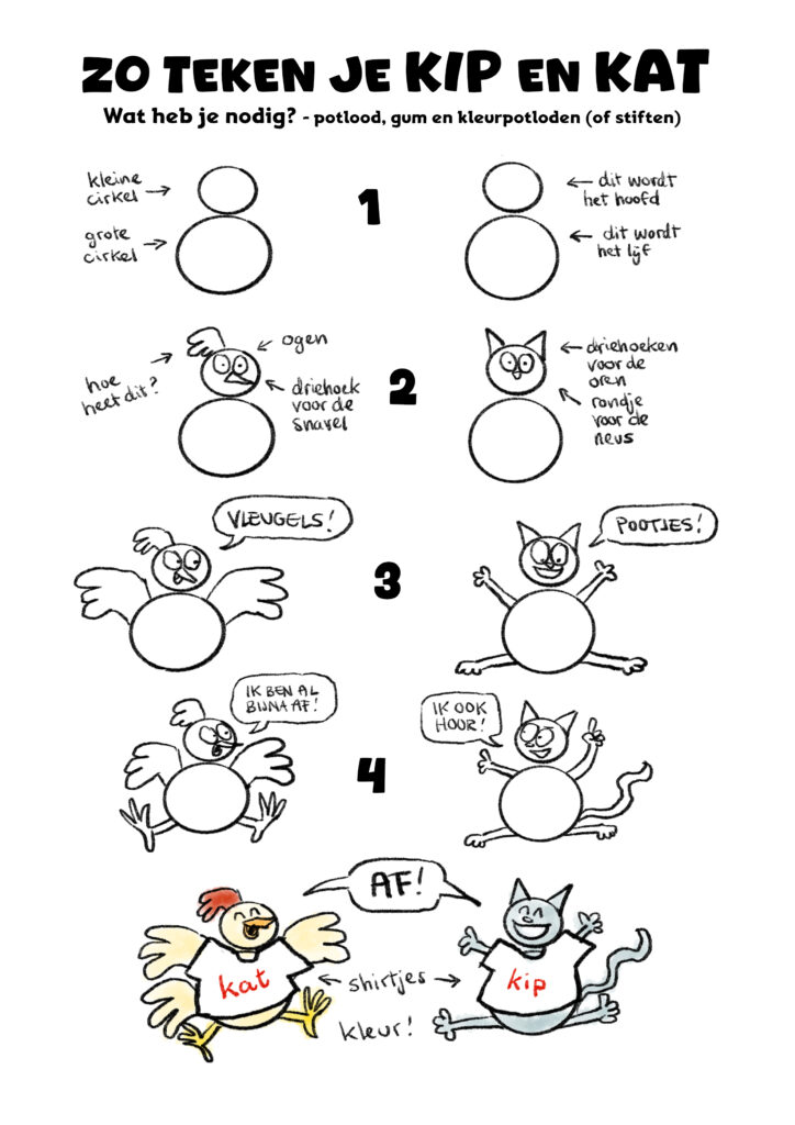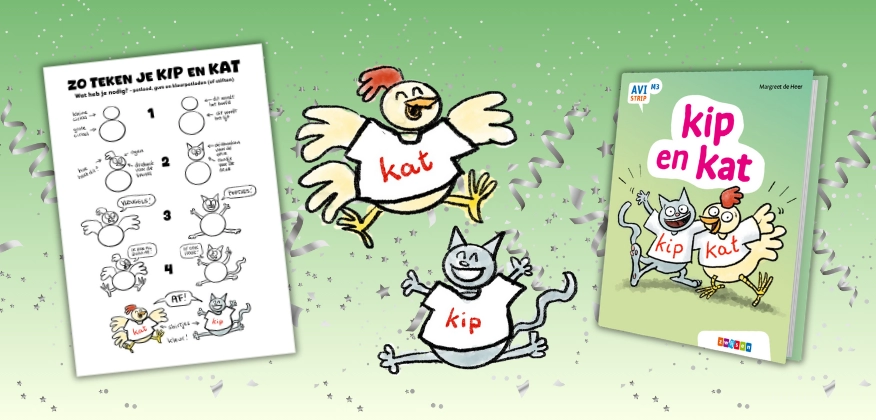 Ken jij kip en kat al? Deze twee stripfiguren zijn niet alleen winnaars van de Zilveren Griffel, ze zijn ook nog eens ontzettend leuk om te tekenen! Margreet de Heer, auteur én illustrator van de AVI strip kip en kat, heeft een stap-voor-stap doeblad voor je gemaakt waarmee je zelf aan de slag kunt. Pak je potlood, je gum, wat kleurpotloden en een vleugje creativiteit. Voor je het weet heb je jouw eigen strip gemaakt met deze twee grappige figuren!