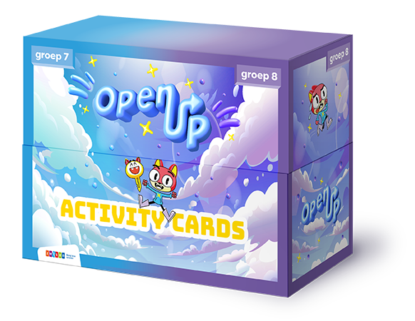 De activity box is ontwikkeld in samenwerking met Spelen met Engels. Per unit heeft Open Up 10 activity cards waar leerlingen op elk moment alleen óf in tweetallen (spreekvaardigheid) mee aan de slag kunnen. De activity cards zijn er op 3 niveaus. De activity box is in zijn geheel beschikbaar vanaf schooljaar 2027/2028. In schooljaar 2026/2027 zullen er wel een aantal activity cards digitaal beschikbaar komen.