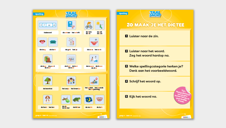 Leerlingen kunnen de Categorieposter gebruiken als ze op weg geholpen willen worden. Op de poster staat, per categorie, een voorbeeldwoord met een korte uitleg over de spellingregel of -afspraak. Je kunt zelf handig naar de poster verwijzen bij het geven van instructie of het nabespreken van dictees.