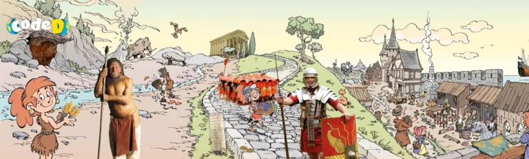 De Code D tijdbalk is gemaakt van stevig canvas in het formaat 4 m x 40 cm. Inclusief activiteitensuggesties voor actief gebruik van de tijdbalk en nog meer historisch tijdsbesef. De activiteitensuggesties vindt je in de leerkrachtsoftware.