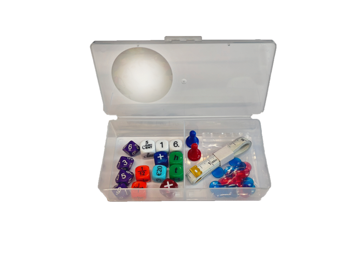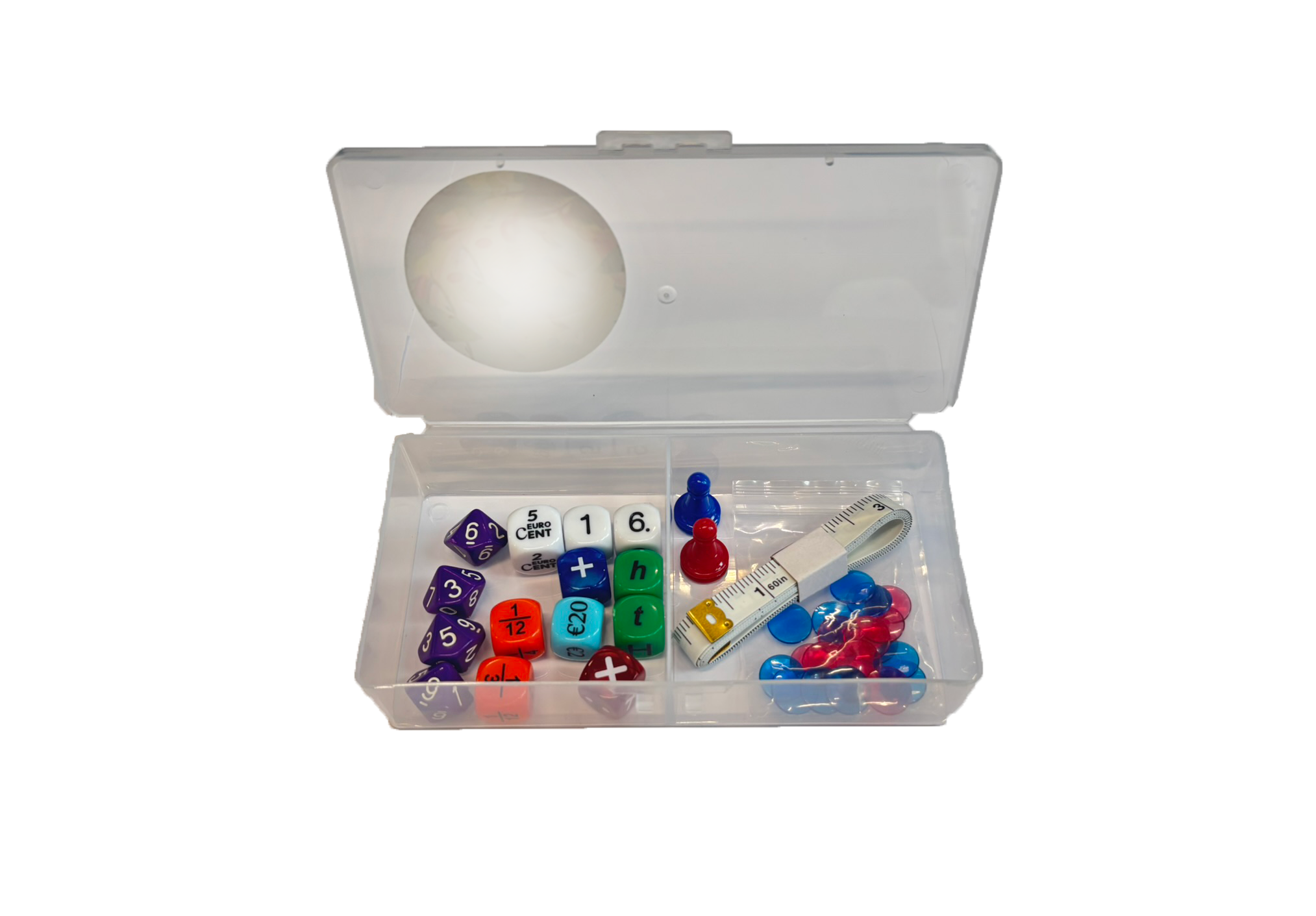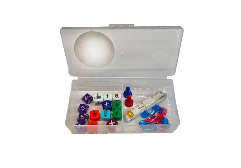 Elke leerling heeft één rekenbakje en heeft zo altijd rekenmateriaal binnen handbereik. Het is te gebruiken in alle jaargroepen en bevat handige materialen zoals dobbelstenen, een meetlint, pionnen en fiches. Handig tijdens de instructie of bij opdrachten met de activiteitenkaarten!