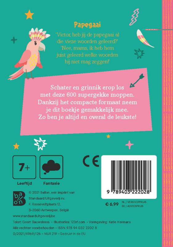 Schater en grinnik erop los met deze 600 supergrappige moppen. Dankzij het compacte formaat neem je dit boekje gemakkelijk mee. Zo ben je altijd en overal de grappigste.