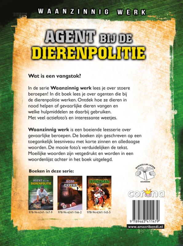 In de serie Waanzinnig werk lees je over stoere beroepen! In dit boek lees je over agenten die bij de dierenpolitie werken. Ontdek hoe ze dieren in nood helpen of gevaarlijke dieren vangen en welke hulpmiddelen ze daarbij gebruiken. Met veel actiefoto’s en interessante weetjes.
