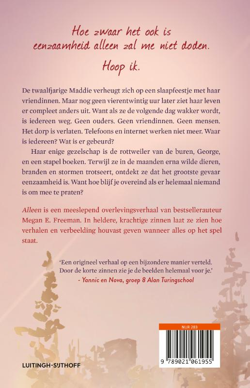 Megan E. Freeman schreef met Alleen een meeslepend overlevingsverhaal over een twaalfjarig meisje dat in haar eentje moet zien te overleven. Het boek bestormde in de VS allerlei bestsellerlijsten. Alleen is een ware pageturner, waarin de auteur de lezer laat nadenken over de kracht van verbeelding en hoe verhalen in moeilijke tijden houvast kunnen bieden. Door de versvorm is dit boek ook geschikt voor moeilijke lezers.