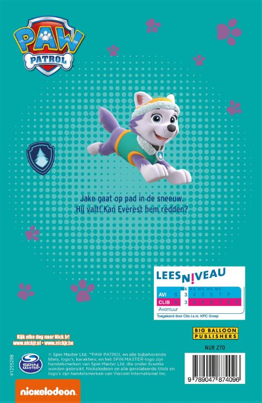 Leer lezen met de heldhaftige pups van PAW Patrol in ons spannende AVI-leesboekje! Ontworpen om beginnende lezers te ondersteunen, volgt dit boekje de avonturen van Chase, Marshall, Skye en de rest van het team terwijl ze de dag redden. In ‘PAW Patrol: Everest redt de dag’, van de serie ‘Ik leer lezen!’, gaan de pups op bezoek bij Jake, die op de Noordpool woont. Maar voordat ze daar aangekomen zijn belt Jake de PAW Patrol, omdat hij in gevaar is. Gelukkig is daar een dappere husky, Everest. Zij schiet Jake te hulp en na haar dappere reddingsactie wordt ze lid van de PAW Patrol. De kleurrijke illustraties en de makkelijk te volgen tekst maken dit verhaaltje geschikt voor beginnende lezers.