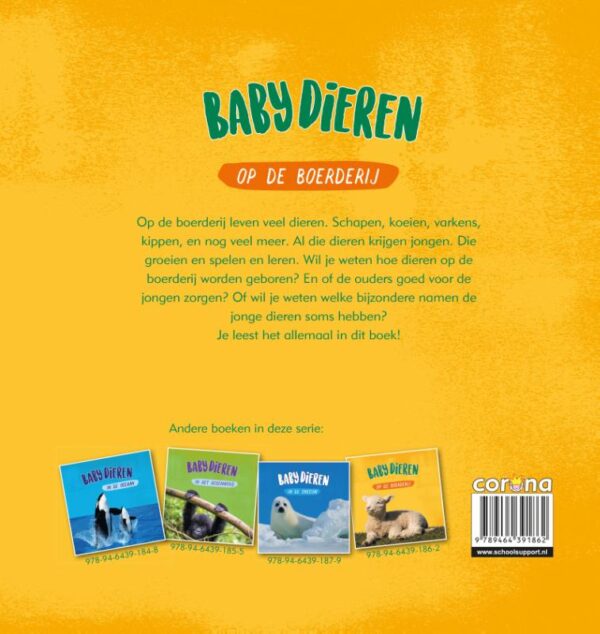 Op de boerderij leven veel dieren. Schapen, koeien, varkens, kippen en nog veel meer. Al die dieren krijgen jongen. Die groeien en spelen en leren. Wil je weten hoe dieren op de boerderij worden geboren? En of de ouders goed voor de jongen zorgen? Of wil je weten welke bijzondere namen de jonge dieren soms hebben? je leest het allemaal in dit boek!