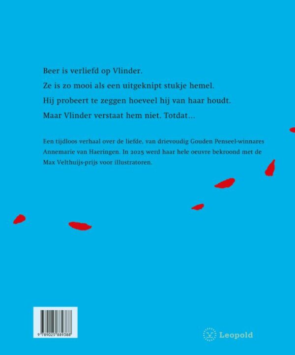 Beer is verliefd op Vlinder, die zo mooi is als een uitgeknipt stukje hemel. Hij probeert te zeggen hoeveel hij van haar houdt. Maar Vlinder verstaat hem niet… Annemarie van Haeringen ontving voor dit boek het Gouden Penseel 2005, eerder kreeg ze het Gouden Penseel: in 1999 voor ‘Malmok‘ en in 2000 voor ‘De prinses met de lange haren‘. In 2003 werd ‘Het begin van de zee‘ bekroond met een Zilveren Griffel. Annemarie van Haeringen ontving in 2025 de Max Velthuijs-prijs, de driejaarlijkse staatsprijs voor het gehele oeuvre van een Nederlandse illustrator.