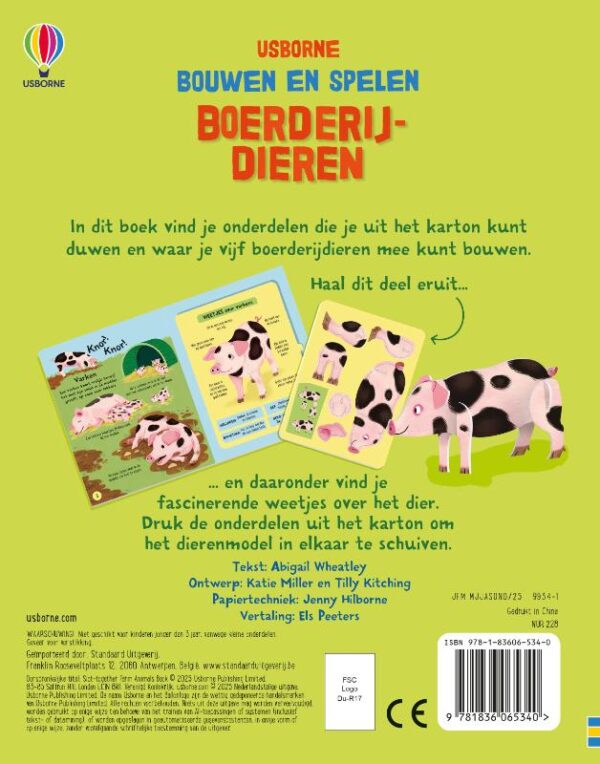 Een boek met vijf boerderijdieren die bestaan uit stukjes die je uit het karton kunt drukken en in elkaar kunt zetten, met instructies en informatie over de dieren.