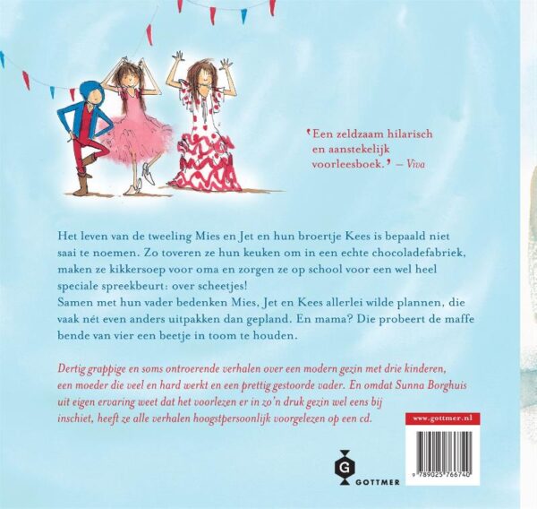Een lekker dik boek over de bende van vier: tweeling Mies en Jet, hun jongere broertje Kees en hun gekke vader.. In dit heerlijk dikke voorleesboek staan maar liefst 30 verhalen. Zo moet Kees bijvoorbeeld een spreekbeurt houden op school, maar hij weet geen leuk onderwerp. Poezen, dino’s – daarover is al honderd keer verteld. Maar dan krijgt papa een van zijn geniale ingevingen: waarom niet een spreekbeurt over scheetjes?