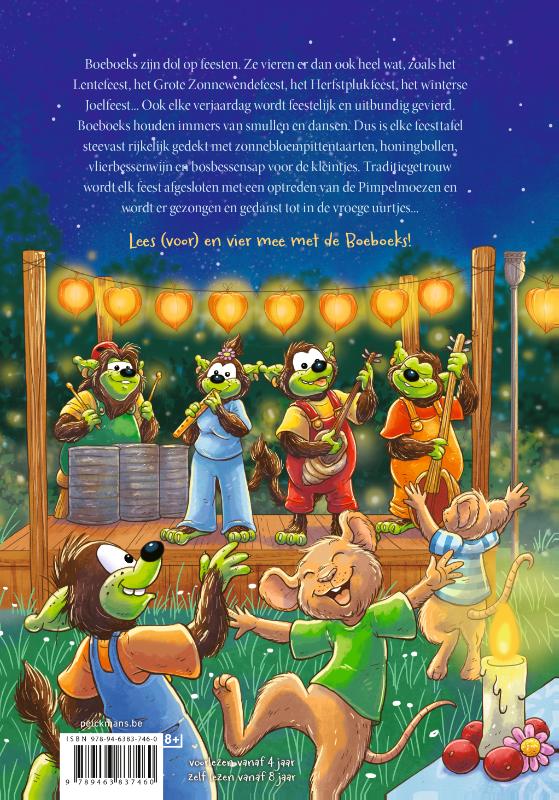 Boeboeks zijn dol op feesten. Ze vieren er dan ook heel wat, zoals het Lentefeest, het Grote Zomerzonnewendefeest, het Herfsteplukfeest, het Winterjoelfeest… Ook elke verjaardag wordt feestelijk en uitbundig gevierd. Boeboeks houden immers van smullen en dansen. Dus is elke feesttafel steevast rijkelijk gedekt met zonnebloempittentaarten, honingbollen, vlierbessenwijn en bosbessensap voor de kleintjes. Traditiegetrouw wordt elk feest afgesloten met een optreden van de Pimpelmoezen en wordt er gezongen en gedanst tot in de vroege uurtjes…