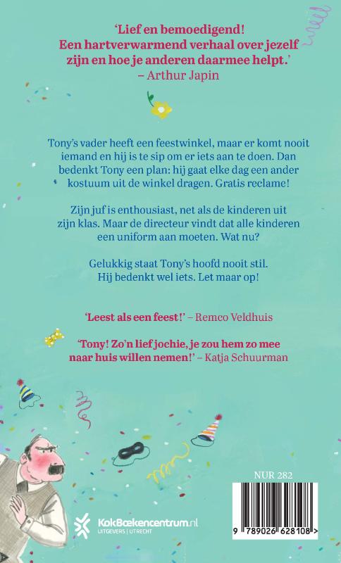 De geniale avonturen van Tony Confetti is een boek vol kostuums en lef. Tony bedenkt een plan om de feestwinkel van zijn sippe vader uit het slop te helpen: hij draagt iedere dag een ander kostuum. Gratis reclame! Zijn juf is enthousiast, maar de schooldirecteur vindt dat alle kinderen er hetzelfde uit moeten zien en dus een uniform moeten dragen. Wat nu?