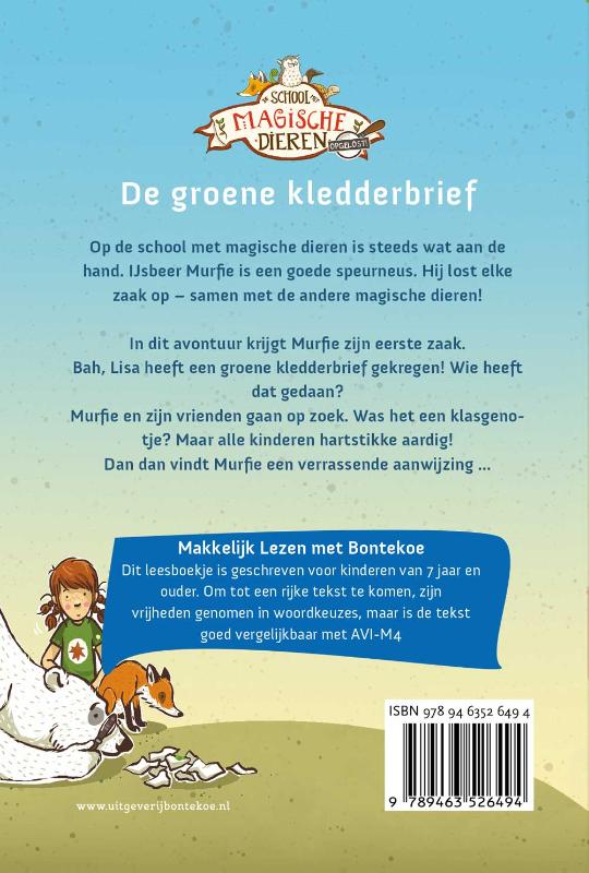 Op de school met magische dieren is steeds wat aan de hand. IJsbeer Murfie is een goede speurneus. Hij lost elke zaak op – samen met de andere magische dieren! In dit avontuur krijgt Murfie zijn eerste zaak. Bah, Lisa heeft een groene kledderbrief gekregen! Wie heeft dat gedaan? Murfie en zijn vrienden gaan op zoek. Was het een klasgenoot- je? Maar alle kinderen hartstikke aardig! Dan dan vindt Murfie een verrassende aanwijzing …