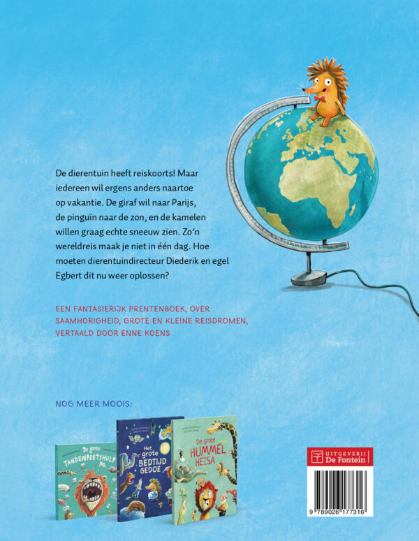 De dierentuin heeft reiskoorts! Maar iedereen wil ergens anders naartoe op vakantie. De giraf wil naar Parijs, de pinguïn naar de zon, en de kamelen willen graag echte sneeuw zien. Zo'n wereldreis maak je niet in één dag. Hoe moeten dierentuindirecteur Diederik en egel Egbert dit nu weer oplossen?