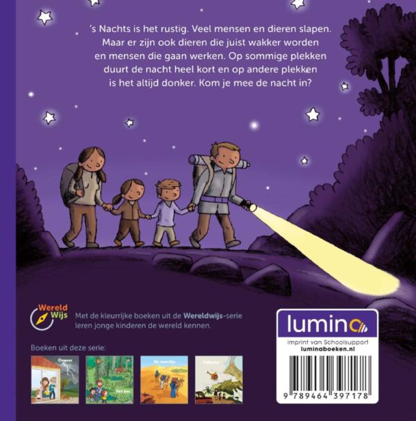 ’s Nachts is het rustig. Veel mensen en dieren slapen. Maar er zijn ook dieren die juist wakker worden en mensen die gaan werken. Op sommige plekken duurt de nacht heel kort en op andere plekken is het altijd donker. Kom je mee de nacht in?
