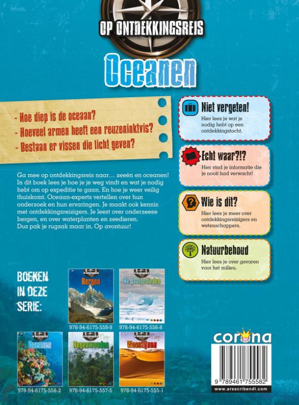 Ga mee op ontdekkingsreis naar… zeeën en oceanen! In dit boek lees je hoe je je weg vindt en wat je nodig hebt om op expeditie te gaan. En hoe je weer veilig thuiskomt. Oceaan-experts vertellen over hun onderzoek en hun ervaringen. Je maakt ook kennis met ontdekkingsreizigers. Je leest over onderzeese bergen, en over waterplanten en zeedieren.