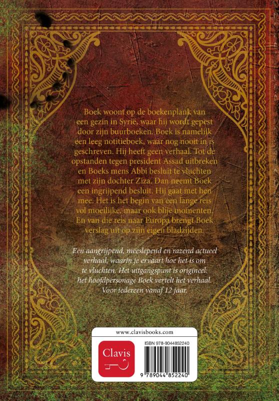 Boek woont op de boekenplank van een gezin in Syrië, waar hij wordt gepest door zijn buurboeken. Boek is namelijk een leeg notitieboek, waar nog nooit in is geschreven. Hij heeft geen verhaal. Tot de opstanden tegen president Assad uitbreken en Boeks mens Abbi besluit te vluchten met zijn dochter Ziza. Dan neemt Boek een ingrijpend besluit. Hij gaat met hen mee. Het is het begin van een lange reis vol moeilijke, maar ook blije momenten. En van die reis naar Europa brengt Boek verslag uit op zijn eigen bladzijden.
