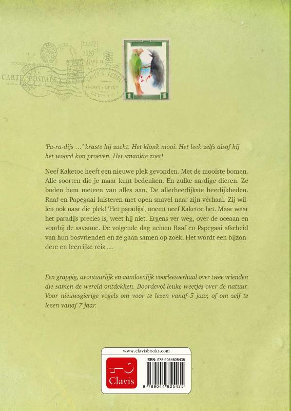 Neef Kaketoe heeft een nieuwe plek gevonden. Met de mooiste bomen. Alle soorten die je maar kunt bedenken. En zulke aardige dieren. Ze boden hem meteen van alles aan. De allerheerlijkste heerlijkheden. Raaf en Papegaai luisteren met open snavel naar zijn verhaal. Zij willen ook naar die plek! ‘Het paradijs’, noemt neef Kaketoe het. Maar waar het paradijs precies is, weet hij niet. Ergens ver weg, over de oceaan en voorbij de savanne. De volgende dag nemen Raaf en Papegaai afscheid van hun bosvrienden en ze gaan samen op zoek. Het wordt een bijzondere en leerrijke reis …