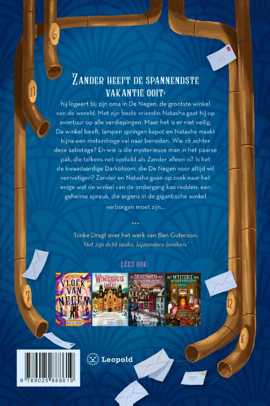 Voor de liefhebbers van Winterhuis Hotel is er nu De schaduw van Negen van Ben Guterson, het spannende tweede deel, weer meesterlijk vertaald door Imme Dros. In dit nieuwe avontuur vol woordpuzzels en aanwijzingen worden Zander en Natasha meegezogen in De Negen, het bijzondere winkelcentrum van Zanders oma met duizelingwekkende verdiepingen. Werknemers van het warenhuis gedragen zich vreemd en Zander en Natasha worden het doelwit van aanvallen. Wanneer een verwoestende magische spreuk De Negen in gevaar brengt, raken Zander en Natasha verwikkeld in een race tegen de klok om het wereldberoemde winkelcentrum te redden van de ondergang.