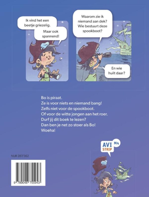 Piraat Bo is niet bang, ook niet voor de witte jongen op de boot. Is het een spook? De andere piraten duiken weg, maar Bo komt in actie! Spannende strip met humor op AVI M4.