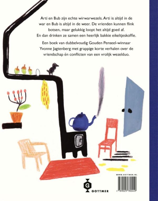 Arti en Bub zijn de wirwarwezels! Het dikke voorleesboek ‘De wirwarwezels’ van tweevoudig Gouden Penseel-winnares Yvonne Jagtenberg zit vol met grappige verhalen over de twee vrienden. Arti is altijd in de war en Bub is altijd in de weer. Gelukkig lopen alle avonturen meestal goed af, met een lekker bakkie troost: eikeltjeskoffie!