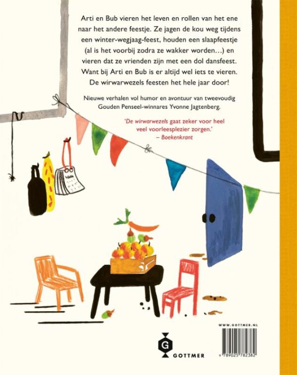 Na het succes van ‘De wirwarwezels’ en ‘De wirwarwezels op weg!’, waarin we de vriendschap, humor en conflicten van Arti en Bub leerden kennen, neemt dubbel Gouden Penseel-winnares Yvonne Jagtenberg ons mee op een nieuw avontuur. ‘De wirwarwezels feesten!’ is een heerlijk eigenzinnig en supergrappig kinderboek, een boek zoals alleen Yvonne Jagtenberg dat kan maken. Met haar gevoel voor humor en haar rake illustraties slaagt Jagtenberg erin complexe thema’s op een toegankelijke manier aan te snijden. De boeken van de wirwarwezels zijn zonder twijfel de leukste voorleesboeken voor kinderen vanaf 5 jaar.