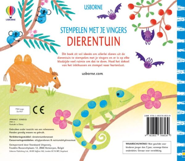 Vrolijk doeboek vol ideeën om met de zeven kleuren inkt en je vingers dierentuindieren te stempelen.