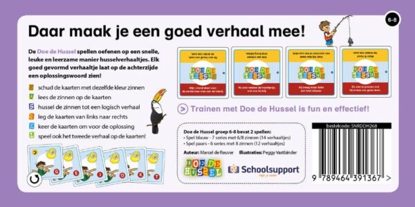 De ‘Doe de hussel’ spellen oefenen op een snelle, leuke en leerzame manier husselverhaaltjes. Elk goed gevormd verhaaltje laat op de achterzijde een oplossingswoord zien!