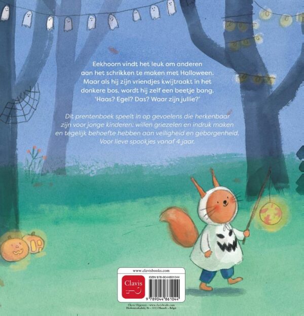 Eekhoorn vindt het leuk om anderen aan het schrikken te maken met Halloween. Maar als hij zijn vriendjes kwijtraakt in het donkere bos, wordt hij zelf een beetje bang. ‘Haas? Egel? Das? Waar zijn jullie?’
