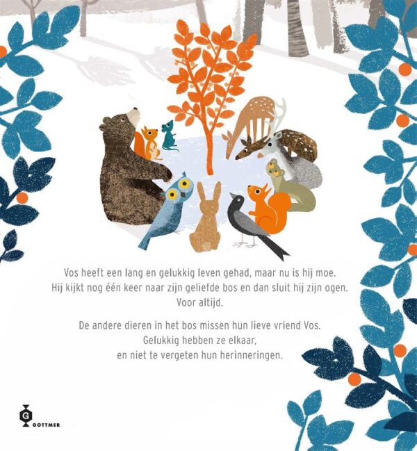 In ‘Een boom vol herinneringen’ heeft Vos een lang en gelukkig leven gehad, maar nu is hij moe. Hij zoekt een mooi plekje uit in het bos en valt in slaap. Voor altijd.