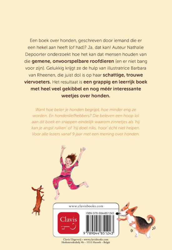 Een boek over honden, geschreven door iemand die er een hekel aan heeft (of had)? Ja, dat kan! Auteur Nathalie Depoorter onderzoekt hoe het kan dat mensen houden van die gemene, onvoorspelbare roofdieren (en er niet bang voor zijn). Gelukkig krijgt ze de hulp van illustratrice Barbara van Rheenen, die juist dol is op haar schattige, trouwe viervoeters.