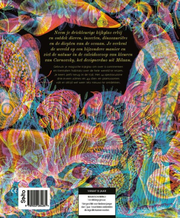 Neem je driekleurige kijkglas erbij en ontdek dieren, insecten, dinosauriërs en de diepten van de oceaan. Je verkent de wereld op een bijzondere manier en ziet de natuur in de caleidoscoop van kleuren van Carnovsky, het designerduo uit Milaan.