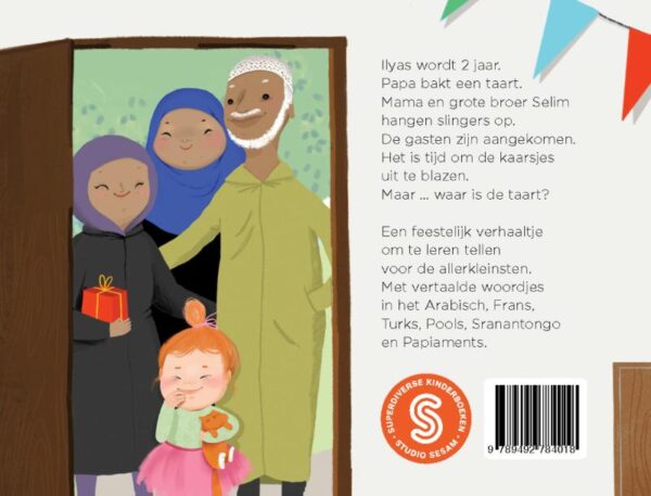 Een feestelijk verhaaltje om te leren tellen voor de allerkleinsten met vertaalde woordjes in het Arabisch, Turks, Frans, Pools, Sranantongo en Papiaments.