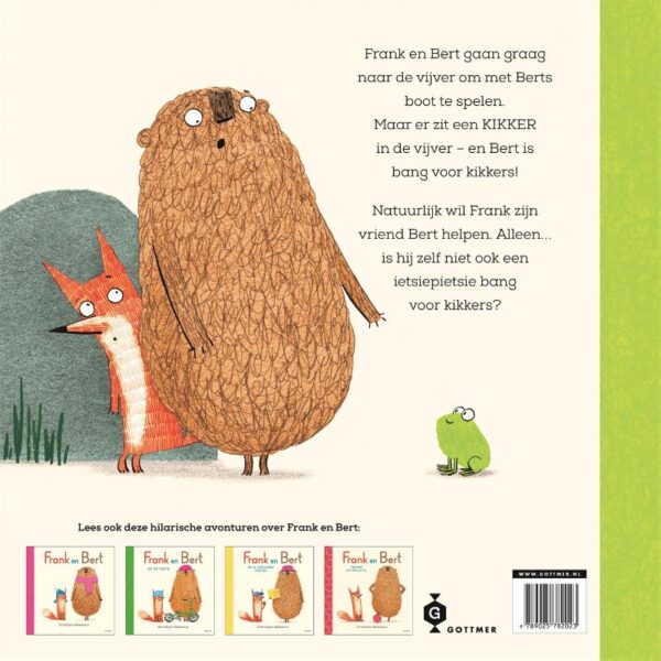 De beste vrienden Frank en Bert beleven weer een grappig avontuur, vol kikkers, vriendschap en het onder ogen zien van je angsten en moed. Frank en Bert houden ervan om met de speelgoedboot van Bert op de kleine vijver te zeilen. Maar – o nee! – er zit een KIKKER in de vijver. Bert is heel bang voor kikkers. Arme Bert! Gelukkig heeft hij zijn dappere vriend Frank bij zich… maar is Frank stiekem ook niet een béétje bang?
