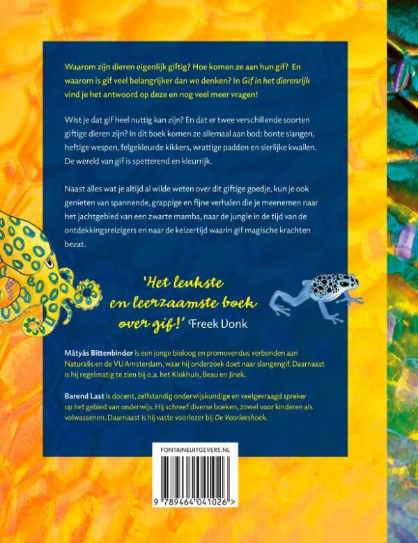 Goeie vraag: waarom zijn dieren eigenlijk giftig? Hoe komen ze aan hun gif? En waarom is gif veel belangrijker dan we denken? Er is nog zoveel te leren over gif: over het gevaar, maar ook over de genezende krachten en het belang voor overleven. Het volledige kleurige register wordt opengetrokken in dit boek: bonte slangen, heftige wespen met hun gifangels, felgekleurde kikkers, padden met hun wrattige huid en sierlijke lichtgevende kwallen. De wereld van gif is namelijk ook een heel spetterende, knetterende en kleurrijke wereld.