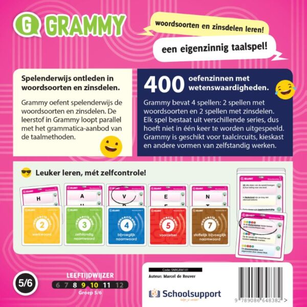 Grammy voor groep 5-6 oefent spelenderwijs de woordsoorten en zinsdelen. Het spel is verpakt in een moderne, stevige doos. De 4 oefenspellen met zelfcontrole zet je snel en makkelijk in. De leerstof in Grammy loopt parallel met het grammatica-aanbod van de taalmethoden.
