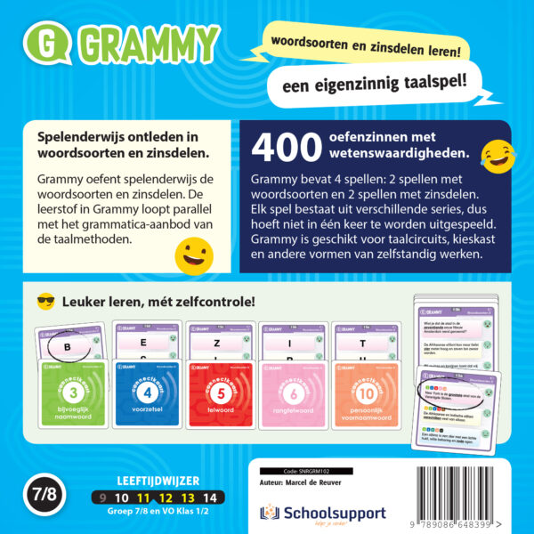 Grammy dozen voor groep 7-8/VO oefent spelenderwijs de woordsoorten en zinsdelen. Het spel is verpakt in een moderne, stevige doos. De 4 oefenspellen met zelfcontrole zet je snel en makkelijk in. De leerstof in Grammy loopt parallel met het grammatica-aanbod van de taalmethoden.