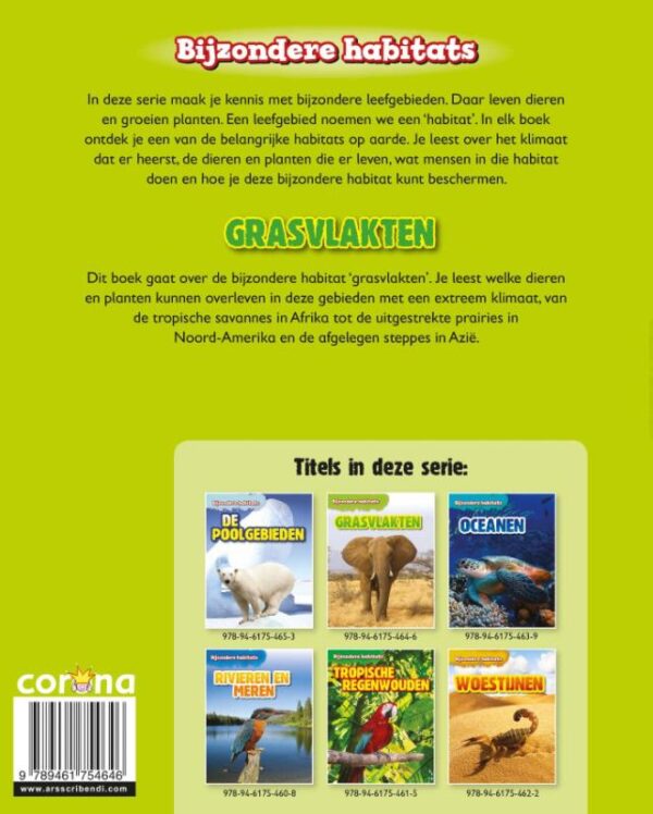 Dit boek gaat over de bijzondere habitat ‘grasvlakten’. Je leest welke dieren en planten kunnen overleven in deze gebieden met een extreem klimaat, van de tropische savannes in Afrika tot de uitgestrekte prairies in Noord-Amerika en de afgelegen steppes in Azië.