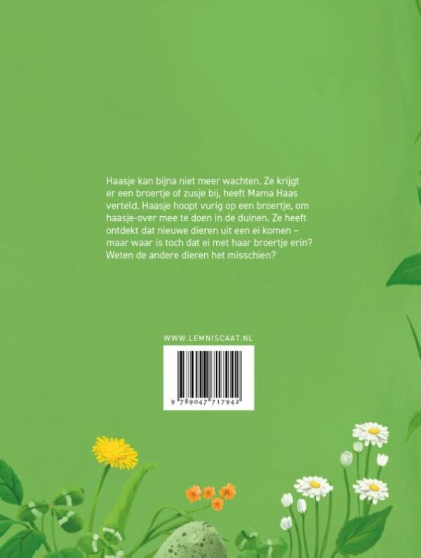 Haasje kan bijna niet meer wachten. Ze krijgt er een broertje of zusje bij, heeft Mama Haas verteld. Haasje hoopt vurig op een broertje, om haasje-over mee te doen in de duinen. Zusjes heeft ze al genoeg.