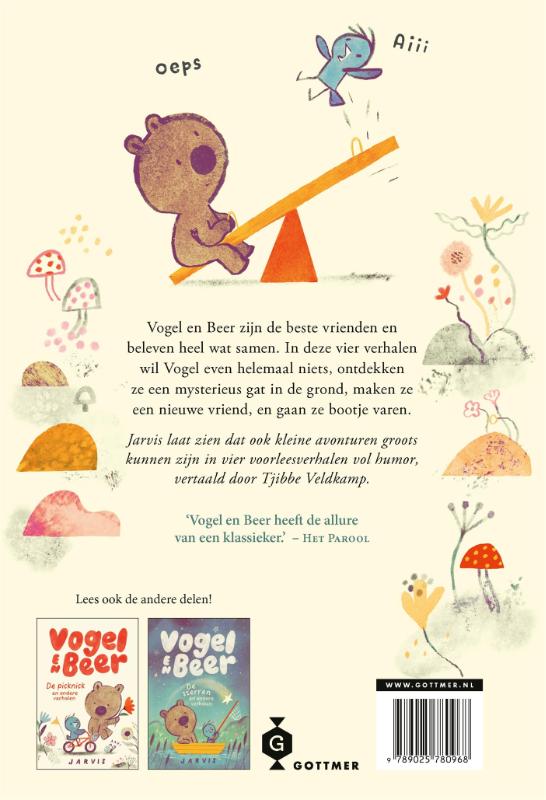 Het eerste voorleesboek over Vogel en Beer, ‘De picknick en andere verhalen’ werd jubelend ontvangen door de Nederlandse pers: ‘De Vogel en Beer-verhalen van Jarvis roepen een grote glimlach op’ (Trouw) en ‘Vogel en Beer heeft de allure van een klassieker’ (Het Parool). Ook het tweede deel van Vogel en Beer, ‘De sterren en andere verhalen’, is door de lezers omarmd. ‘Vogel en Beer 3 – Het avontuur en andere verhalen’ is net als de andere twee Vogel en Beer-boeken vertaald door Tjibbe Veldkamp. Dit kinderboek kun je voorlezen aan kinderen van 5 jaar en ouder.