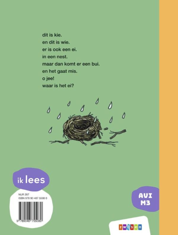 Wie en Kie zijn apetrots. Ze hebben een ei en het ligt veilig, knus en warm in een nest. En dat nest ligt in een boomstam, in de zee. Maar dan begint het ineens hard te regenen. En de stam drijft ver weg. De zee op … De lieve vogels zijn verdrietig en ongerust. Waar is het ei? En hoe gaan ze op zoek? Ze krijgen hulp van hun dierenvrienden. Maar of dat goed afloopt? Beginnende lezers worden uitgedaagd om mee te zoeken en mee te lezen met het verhaal van Wie en Kie. Lukt het ze om het ei terug te vinden?