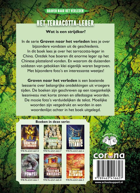 In de serie Graven naar het verleden lees je over bijzondere vondsten uit de geschiedenis. In dit boek lees je over het terracotta-leger in China. Ontdek hoe boeren dit enorme leger op het Chinese platteland vonden. En waarom de duizenden soldaten van gebakken klei eigenlijk waren begraven. Met bijzondere foto’s en interessante weetjes!