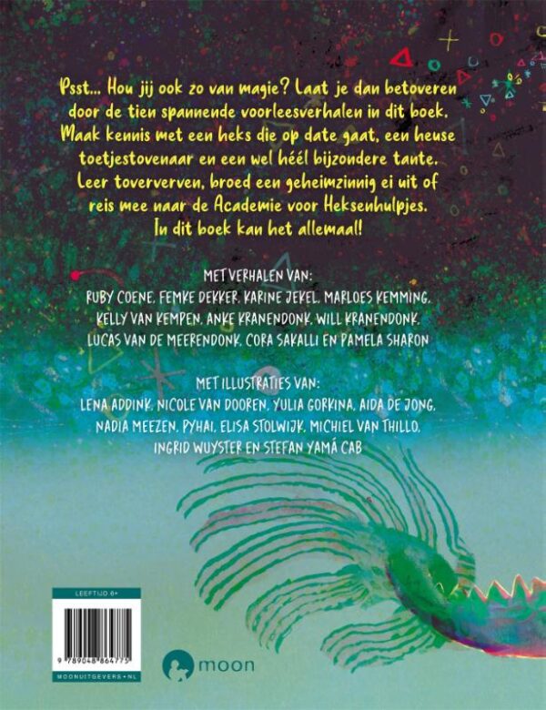 Magie… Wie is daar nou niet dol op?! In deze bundel vind je toffe voorleesverhalen met een magisch tintje. Een verhaal over de Academie voor Heksenhulpjes, over een heks die op date gaat, over een groot, geheimzinnig ei, over een heksenfestival, over het magische getal 7, en nog veel meer… Laat je betoveren door tien heerlijke verhalen, geschreven door verschillende auteurs, die worden begeleid door heel veel prachtige illustraties van verschillende illustratietalenten!