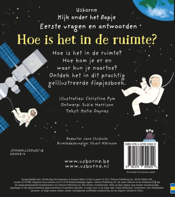 Kinderen zijn gefascineerd door de ruimte en willen er veel over weten. Dit bijzondere boek biedt een heleboel antwoorden op hun vragen en zal nieuwsgierige kinderen blijven boeien. Perfect formaat flapjesboek voor jonge kinderen. Een geweldig leuk boek om over de ruimte te leren en verder op onderzoek te gaan.