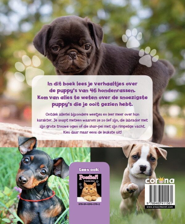 n dit boek lees je verhaaltjes over de puppy’s van 46 hondenrassen.