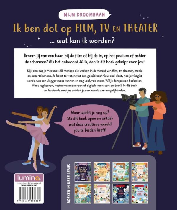 Kijk een dagje mee met 25 mensen die werken in de wereld van film, tv, theater, media en entertainment. Je komt te weten wat een geluidstechnicus zoal doet, hoe je visagist wordt, wat een vlogger moet kunnen en nog veel, veel meer. Wil je danspassen bedenken, films regisseren, kostuums ontwerpen of digitale monsters creëren?