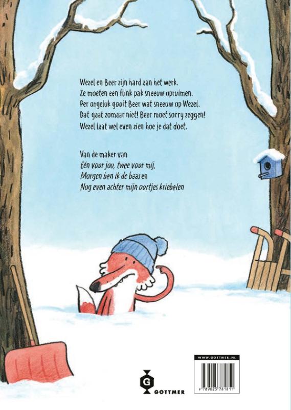 Wezel en Beer moeten samen een berg sneeuw opruimen. Maar als Beer per ongeluk sneeuw op Wezel gooit, loopt de samenwerking flink mis. Wezel wordt boos, heel boos. Dat gaat zomaar niet! Beer moet sorry zeggen. Maar excuses aanbieden, dat blijkt nog niet zo makkelijk… Met veel humor en herkenbare emoties laat dit prentenboek over vriendschap en verontschuldigen zien dat het soms lastig is om een fout toe te geven, maar dat het altijd loont.