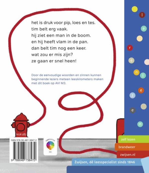 Aansprekend leesboek op AVI M3, speciaal voor kinderen die net leren lezen. Over wat de brandweer allemaal doet. Dan belt Tim, wat is er mis? Door de korte woorden en eenvoudige zinnen kunnen beginnende lezers meteen leeskilometers maken.