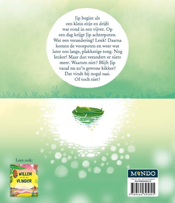 Jip begint als een klein eitje en drijft wat rond in een vijver. Op een dag krijgt Jip achterpoten. Wat een verandering! Leuk! Daarna komen de voorpoten en weer wat later een lange, plakkerige tong. Nog leuker! Maar dan verandert er niets meer. Waarom niet? Blijft Jip vanaf nu zo’n gewone kikker? Dat vindt hij nogal saai. Of toch niet?